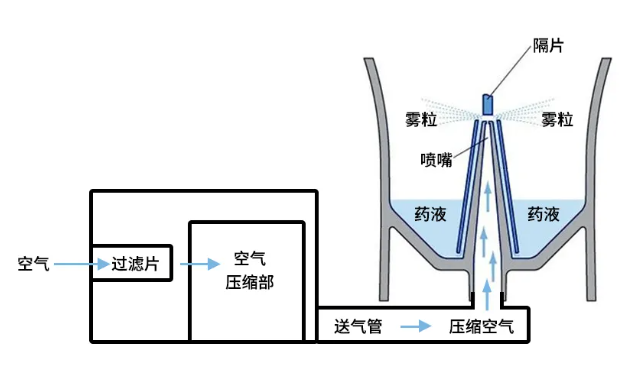 压缩式雾化器(射流式雾化器)的雾化原理,是依据文丘里(Venturi)喷射原理,借助压缩空气通过细小管口形成高速气流,产生负压,进而带动液体或其他流体一同喷射到阻挡物上,在高速撞击下,液滴被击碎成雾状微粒,从出气管喷出。气流的稳定性直接决定了雾化颗粒的大小与均匀性。
