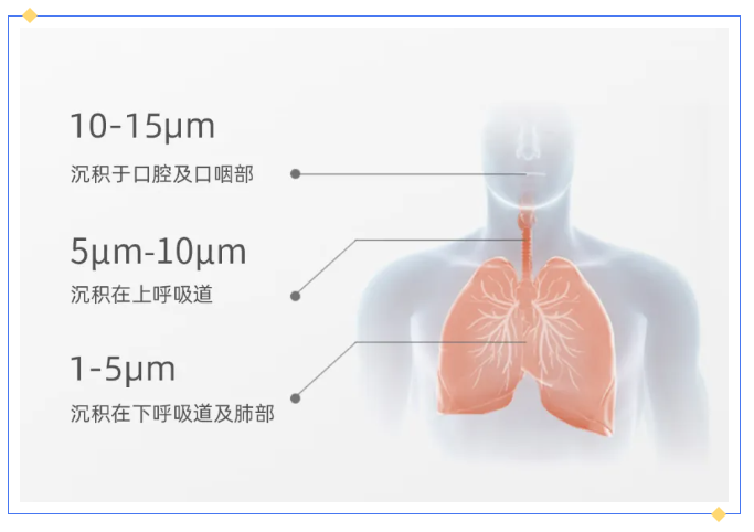 得益于映美专利四缸压缩机平稳的气流输出,雾化器能够产生高占比的细腻雾粒。而雾化颗粒的细腻程度,又与治疗效果息息相关。不同大小的颗粒,作用于呼吸道的部位各有不同:直径10~15μm的雾化颗粒主要沉积在上呼吸道,5~10μm的沉积在气管,而1~5μm的颗粒则能深入沉积在下呼吸道、支气管及肺部。